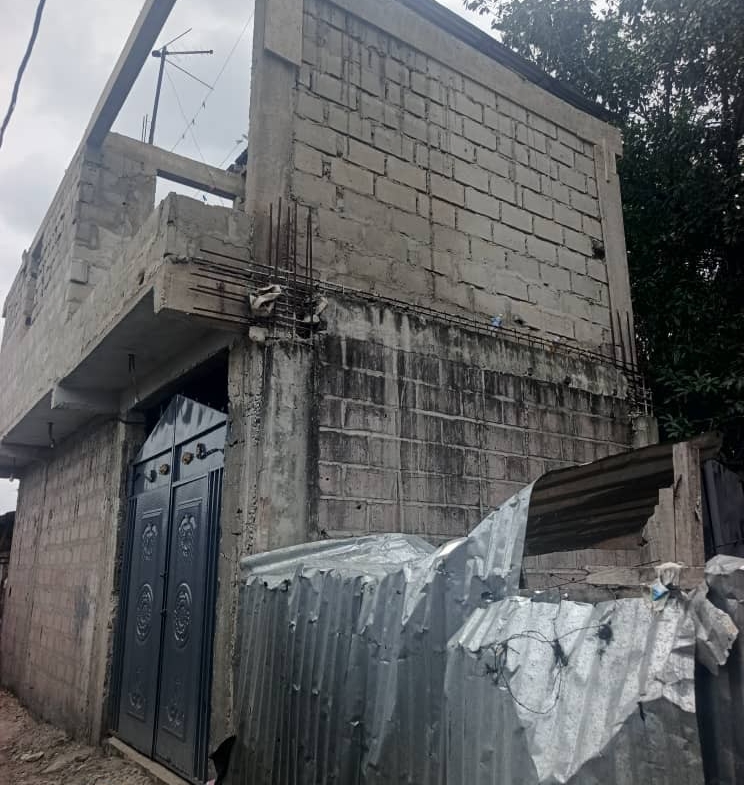 Elle comprend : un bâtiment dont – LE REZ-DE-CHAUSSÉE est entièrement opérationnel avec deux chambres, un salon, une cuisine et une salle de bain. – LE PREMIER NIVEAU est inachevé, mais la fondation est conçue pour supporter un immeuble de type R+2.